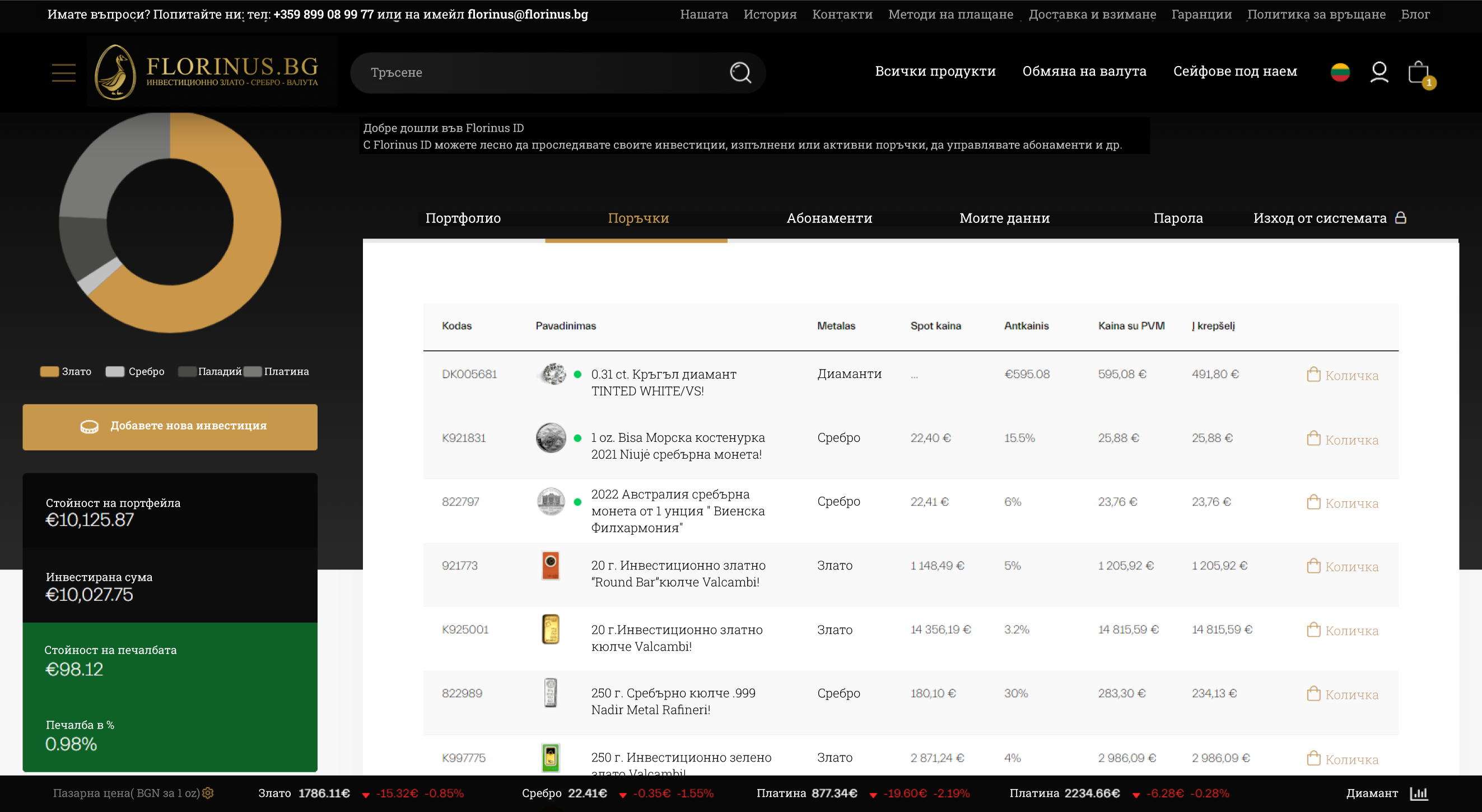 Инвестирането в злато никога не е било по-лесно. Florinus ID е персонализирано цифрово инвестиционно табло, което ви позволява да проследявате инвестициите си, изпълнените и активните поръчки, да управлявате абонаменти и да имате достъп до други функции.