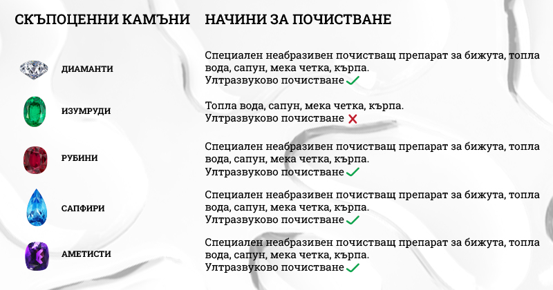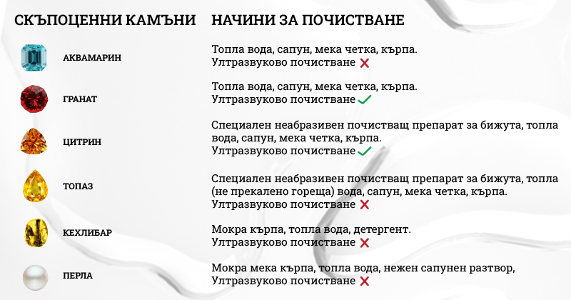 Както виждате, има много начини за почистване на скъпоценни камъни, но не всички са подходящи за всеки камък. За всеки скъпоценен камък също има различен метод за почистване. Ето една таблица, която показва правилната техника за почистване на всеки скъпоценен камък: