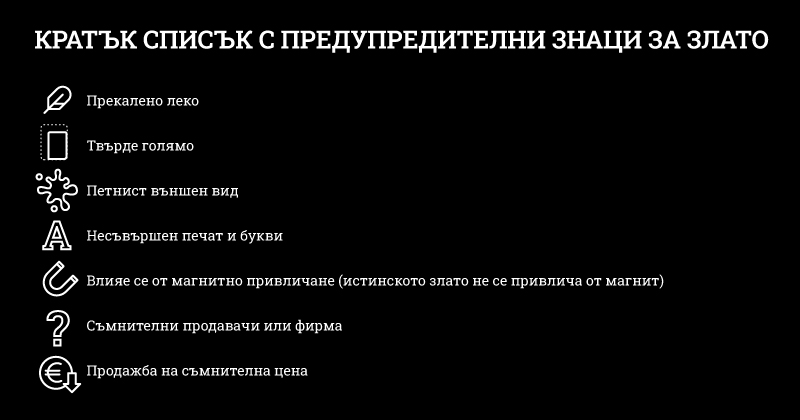Но дали това е достатъчно, за да се разбере дали златото е истинско? Както казахме в началото, със сигурност не - например една златна плочка може да изглежда много професионално изработена и опакована, но това не означава, че е истинска. Затова сме събрали и описали най-добрите начини да избегнете скъпоструваща грешка: