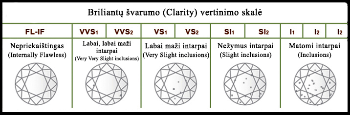 2. Deimantų (Briliantų) švarumas / skaidrumas (Clarity)