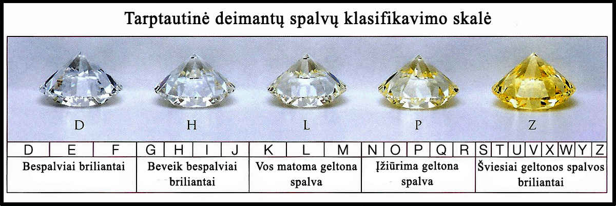 F-D bespalviai (Colorless). Bespalviai deimantai, D raidelės spalvą gali nustatyti tik patyrę ekspertai. Ypatingai reti, aukščiausios kokybės ir vertės deimantai.