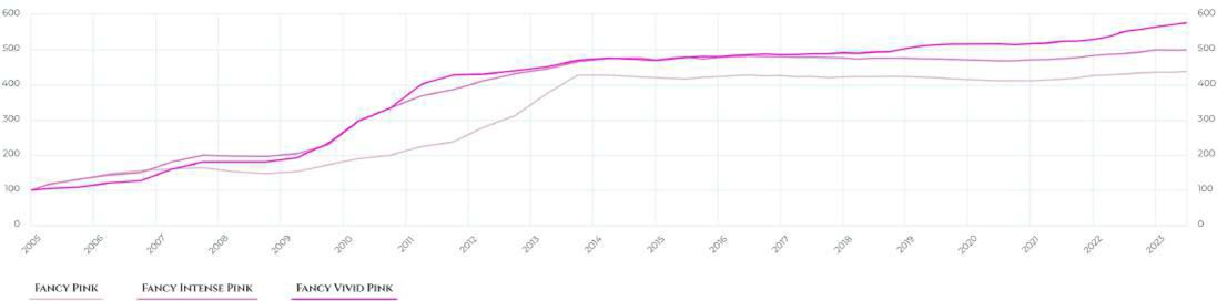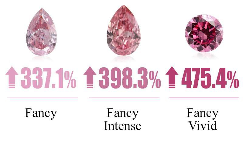 Taip pat verta paminėti, kad per 18 metų visų rožinės spalvos kategorijų deimantų vertė padidėjo. *„Fancy Pink“ (prašmatni rožinė) spalvinės kategorijos deimantų vertė pakilo 337,1 %, o metinė grąža buvo lygi – 18 %. „Fancy Intense Pink“ (prašmatni intensyvi rožinė) spalvinės kategorijos deimantų vertė pakilo 398,3 %, kai metinė grąža – 21,2 %. „Fancy Vivid Pink“ (prašmatni sodri rožinė) spalvinės kategorijos deimantų vertė pakilo – 475,4 %, kai metinė grąža – 25,4 %. *Šaltinis: „Fancy Color Research Foundation“.