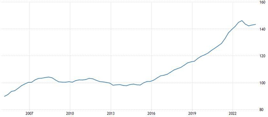 Europos Sąjungos nekilnojamojo turto indekso („Eurostat“) bendras augimo koeficientas - 3,3 % (bendras vertės augimas per 18 metų - 79,5 %, žr. žemiau pateiktą diagramą).