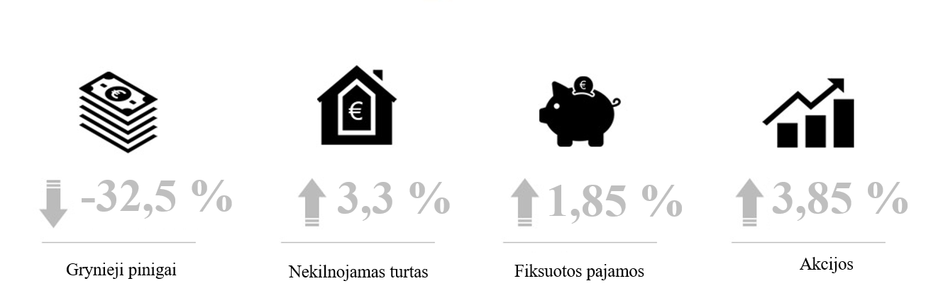 Likvidiems grynųjų pinigų likučiams neigiamos įtakos turi infliacija. Šiuo metu Europoje infliacija yra didžiausia per daugiau nei 40 metų laikotarpį. Labiau nei bet kada svarbu nelaikyti grynųjų pinigų, kad neprarastume realios perkamosios galios. Aukščiau pateiktoje diagramoje galite pamatyti, kaip per pastaruosius dešimtmečius keitėsi infliacijos lygis. Jei vertinsime pastaruosius 18 metų, bendras grynųjų pinigų likučių vertės praradimas siekia -32,5 %.