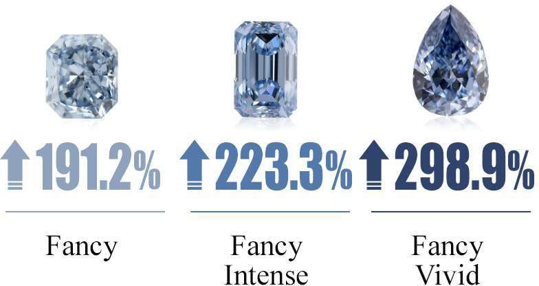 Per 18 metų laikotarpį „Fancy Blue“ (prašmatni mėlyna) spalvinės kategorijos deimantų vertė pakilo 191,2 %, o metinė grąža buvo lygi – 10,2 %. „Fancy Intense Blue“ (prašmatni intensyvi mėlyna) spalvinės kategorijos deimantų vertė pakilo 223,3 %, kai metinė grąža – 11,9 %. „Fancy Vivid Blue“ (prašmatni sodri mėlyna) spalvinės kategorijos deimantų vertė pakilo – 298,9 %, kai metinė grąža – 15,9 %. *Šaltinis: „Fancy Color Research Foundation“.