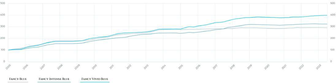 Šioje diagramoje pateikiami visų dydžių „Fancy Blue“, „Fancy Intense Blue“ ir Fancy Vivid Blue“ spalvinių kategorijų deimantų kainų pokyčiai.