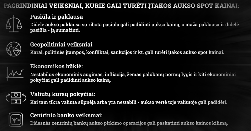 Reikia paminėti, kad šie veiksniai yra tik nedidelė dalis iš daugelio, kuri gali turėti įtakos aukso spot kainai. Aukso rinka yra sudėtinga ir kintanti, todėl kainos svyravimai dažnai atsispindi įvairių rinkos veiksnių sąveikoje.
