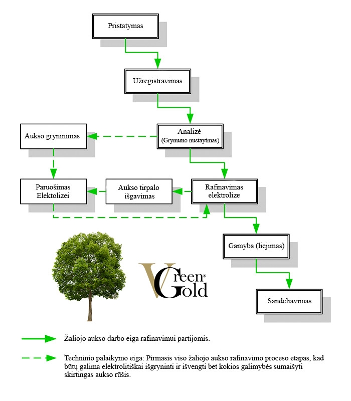 Green Gold žaliojo aukso tvarkymas ir perdirbimas Valcambi įmonėje yra visiškai atskirtas nuo atvykimo vietos iš kasyklos iki rafinavimo ir luitų liejimo ar kaldinimo. Visą šią Žaliojo aukso (Green Gold) tiekimo ir gamybos grandinę taip pat kontroliuoja nepriklausomos priežiūros institucijos ir griežti audito procesai. Todėl Šveicarijos Valcambi kompanija visiškai garantuoja pačius aukščiausius Green Gold aukso luitų moralinius ir kokybės standartus.