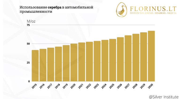 Автомобильная промышленность использует около 1700 тонн серебра в год. Количество серебра, найденного в одном автомобиле, невелико. Однако в общей сумме указанная цифра получается с учетом того, что промышленность выпускает миллион автомобилей в год.