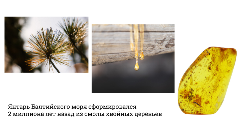 Янтарь был создан из вида сосны - Pinus succinifera. Смола в первую очередь предназначалась для защиты растения, в ней содержится много бактерицидных консервантов, которые очень хорошо защищают организм дерева. Со временем в процессе окисления и полимеризации смола превратилась в янтарь. Янтарь Балтийского моря формировался из сока хвойных деревьев на протяжении 2 миллионов лет, приобретая различные формы и цвета и по пути унося с собой различные окаменелости.