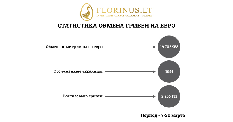 Во всех салонах “Florinus” предоставляется возможность купить желаемую сумму гривен. Эта инициатива позволит и дальше менять гривны на евро и, таким образом, помогать прибывшим в Литву украинцам. Статистика обмена валюты в салонах “Florinus” за последнюю неделюПосле начала обмена гривен на евро, 7 марта был выделен лимит в 100 тысяч евро. Однако уже вечером следующего дня, 8 марта. эта сумма была превышена. Возобновить услуги по обмену валюты помогла идея А. Тапинаса - "Laisvės bankas". Люди не только жертвовали деньги, но и приходили обменивать евро на гривны, чтобы как можно быстрее реализовать их и возобновить их обмен.