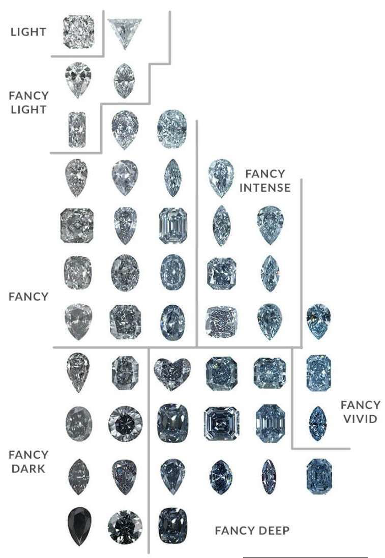 Как мы упоминали ранее, семейство голубых бриллиантов отличается оттенками, интенсивностью и элементами, определяющими цвет бриллиантов. Ниже приведены названия цветовых категорий от самой низкой интенсивности до самой высокой: