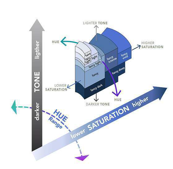 Три основных фактора, которые помогут вам лучше понять разницу в цвете и ценности бриллиантов фантазийных цветов, — это оттенок, насыщенность и тон.